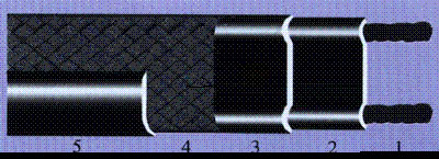 | 结构: [1]铜芯导线(7/0.3,19/0.3,7/0.6) [2]导电塑料内层(PTC材料) [3]聚烯烃或氟塑料绝缘护层 [4]镀锡铜丝编织屏蔽层 [5]聚烯烃或氟塑料加强护层 | ![]() |