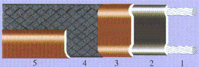 | [1]铜芯导线(7/0.3,19/0.3,7/0.6) [2]导电塑料(PTC材料) [3]聚烯烃或氟塑料绝缘护层 [4]镀锡铜丝编织屏蔽层 [5]聚烯烃或氟塑料加强护层 | ![]() |